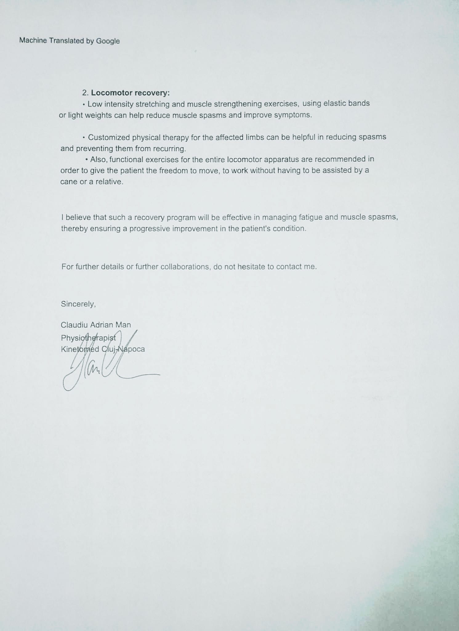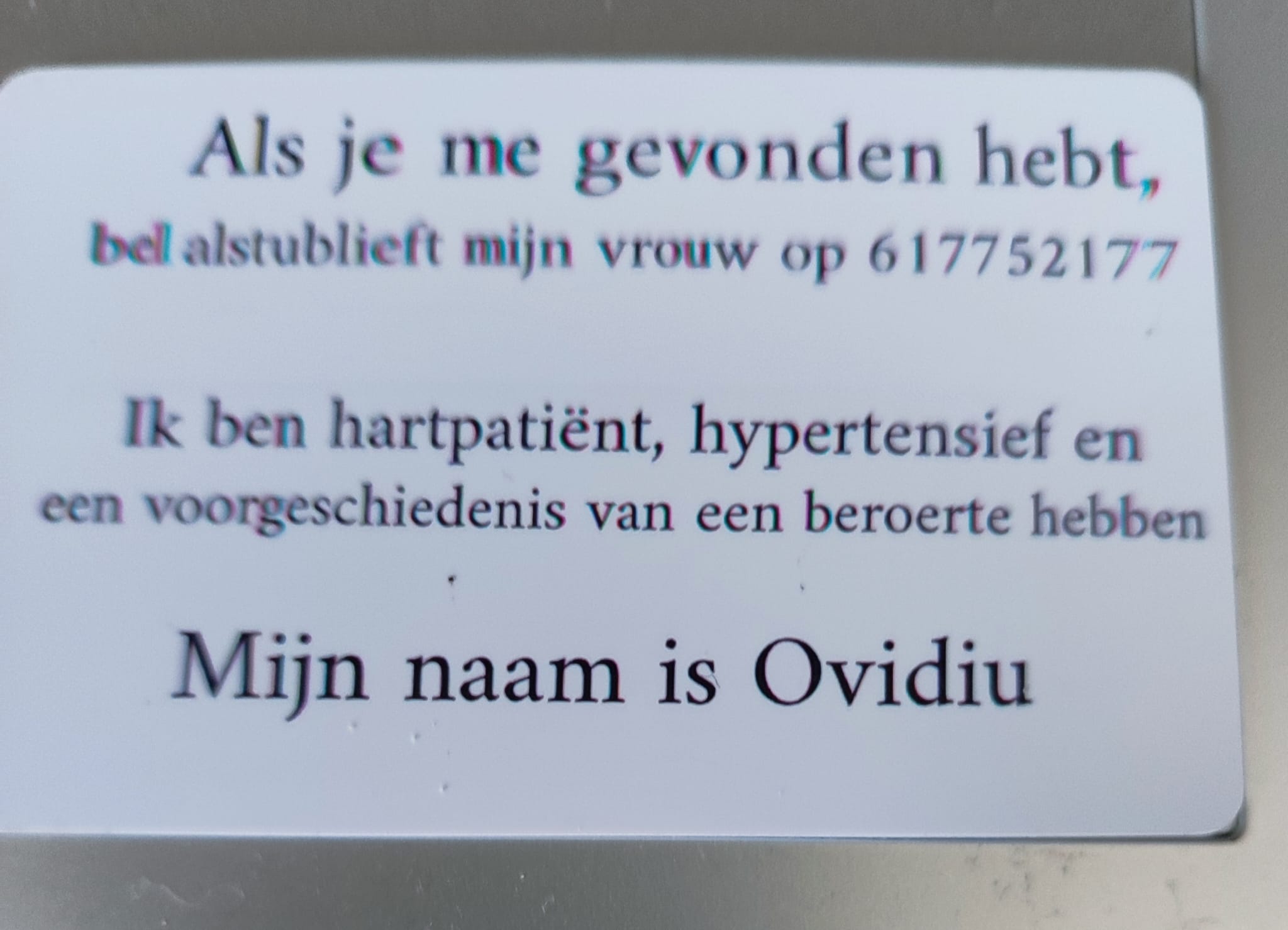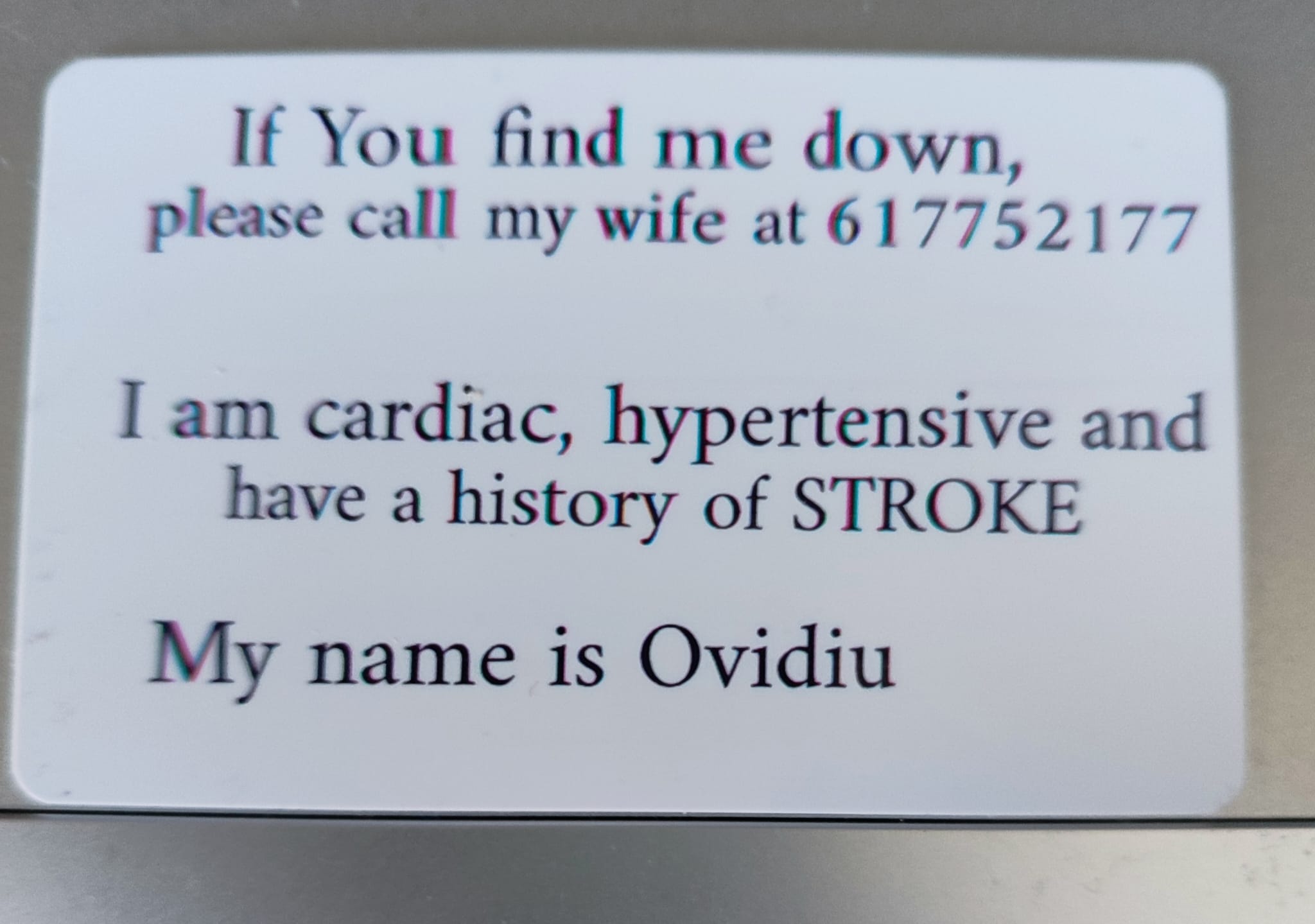 | The doctor believes that he can no longer help me and recommends that: 'To stop fighting for recovery and recommends that I talk to a Romanian-speaking psychologist who can convince me to accept the situation as it is'. Currently: 1. Hypertension is relatively under control with medication. However, there are times when I have imbalances, when I make sudden movements I lose my balance. Any movement must be done slowly to prevent falling.. 2. Locomotor functions Problems and recovery. -I practice daily exercises with the machines at the 040Fit gym to recover hand, leg and breathing functions as well as at home. These exercises are supervised and filmed by a personal trainer. Exercises for locomotor recovery, strength recovery and exercises for diaphragm recovery. -I cannot control muscle spasms in my hand and foot, which is why I cannot drive a car safely. -The right leg has uncontrolled muscle spasms and when moving, lack of balance and confidence in the next step. To prevent falls, I permanently use a Walking Stick. -The right hand has muscle spasms and moments of lack of strength, when I drop any object held in my hand. -I can't drive a bike for the same reason. Lack of control and balance. -When I stand for more than 10 minutes it makes me feel uncomfortable and tired and I have to sit down. 3. The diaphragm condition causes me to feel short of breath, and if I sleep on my right side or back, lung spasms occur. I am also trying to recover my respiratory functions through exercise and medication, but it is very difficult because this condition after the stroke was neglected until October 2024. Because in the Netherlands all the doctors and specialists I spoke to said that it is normal to be tired after a stroke even 18 months after the event, I asked for a second and third opinion in Romania from specialized personnel (first at the Physiotherapy Clinic - "KINETOMED" Cluj-Napoca and later at the Pneumology Clinic of the Ludus City Hospital) The result of the X-ray investigations and the Spirometry tests concluded that the Diaphragm only functions partially and that it is deformed - flattened. This required the urgent start of treatment and exercises specific to diaphragmatic disorders in order to quickly resuscitate the functioning of the diaphragm and be able to return to a somewhat normal life. 4. I sleep every night with a mask connected to the CPAP machine because it is believed that the brain is not receiving enough oxygen. 5. I'm on a diet, so from 96 kg in October 2024, I reduced my own weight to 86 kg in March 2025. So I also reduced the pressure on the diaphragm. But I still need to lose weight, until I reach 75 kg. 6. Because Since I fell into the store a short time ago, I consider it necessary to have the following card with me. |