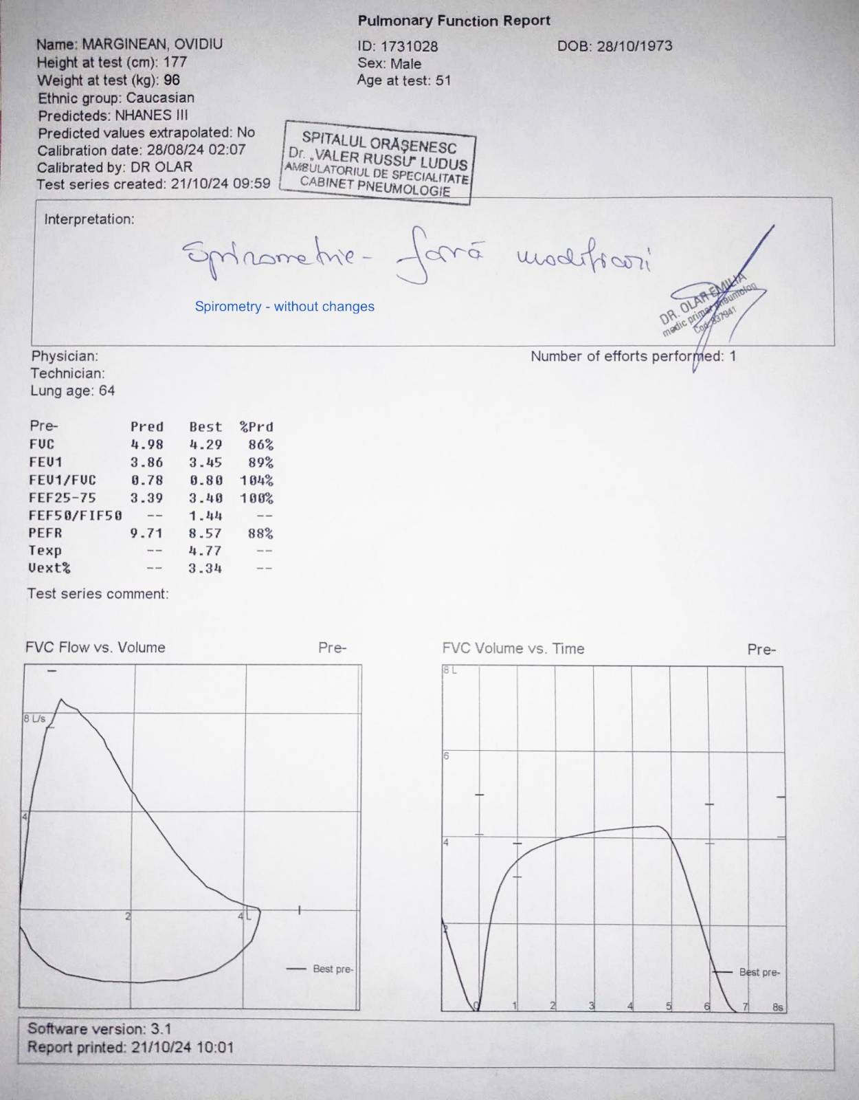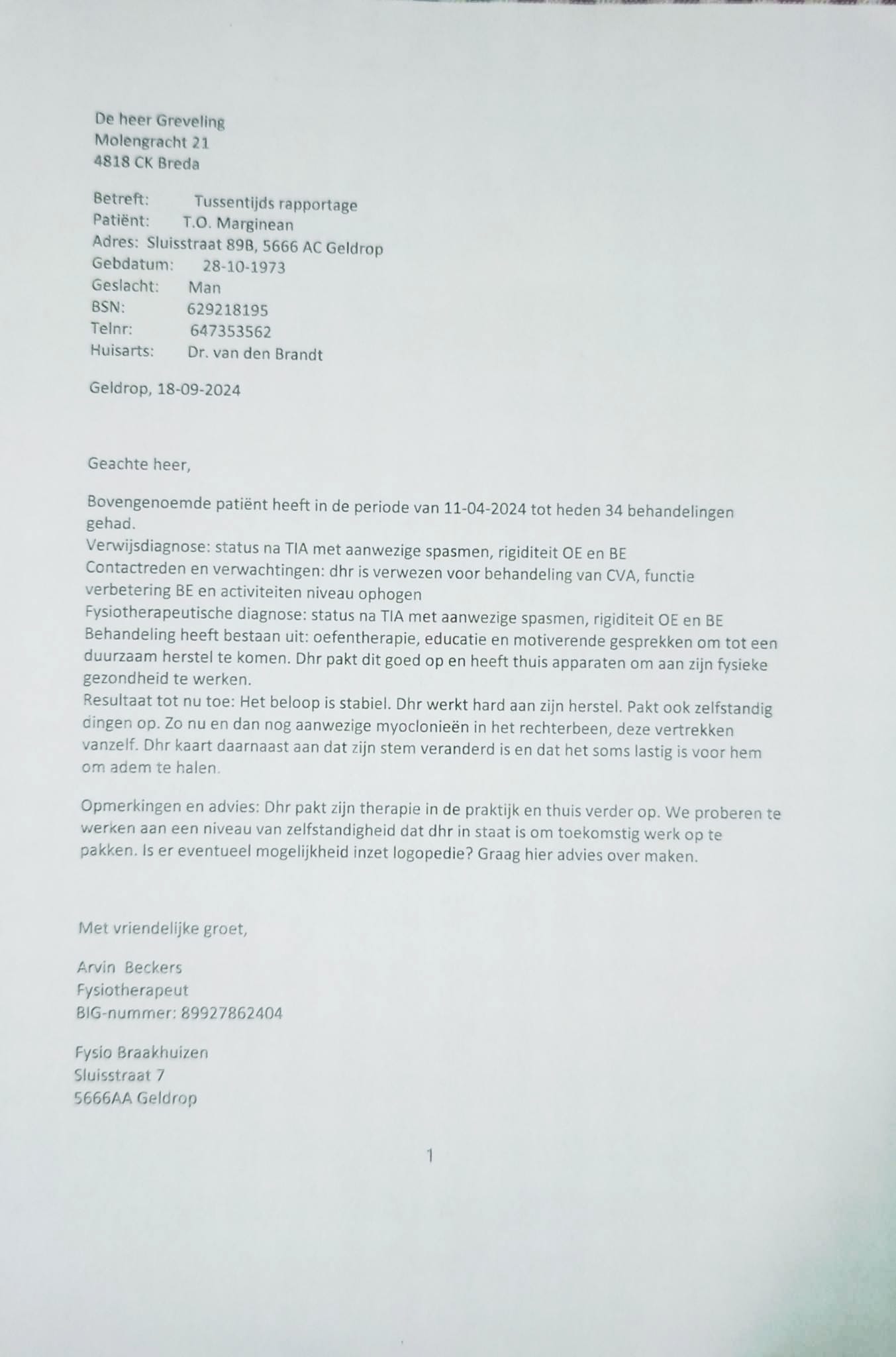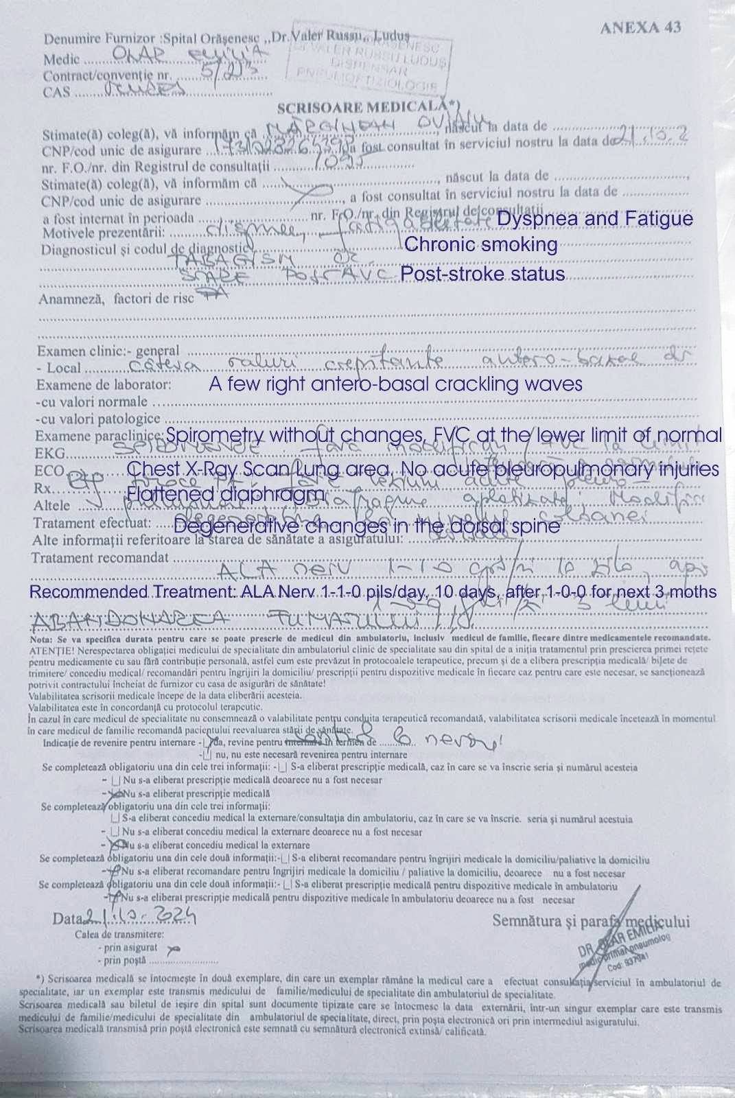 | The doctor believes that he can no longer help me and recommends that: 'To stop fighting for recovery and recommends that I talk to a Romanian-speaking psychologist who can convince me to accept the situation as it is'. Currently: 1. Hypertension is relatively under control with medication. However, there are times when I have imbalances, when I make sudden movements I lose my balance. Any movement must be done slowly to prevent falling.. 2. Locomotor functions Problems and recovery. -I practice daily exercises with the machines at the 040Fit gym to recover hand, leg and breathing functions as well as at home. These exercises are supervised and filmed by a personal trainer. Exercises for locomotor recovery, strength recovery and exercises for diaphragm recovery. -I cannot control muscle spasms in my hand and foot, which is why I cannot drive a car safely. -The right leg has uncontrolled muscle spasms and when moving, lack of balance and confidence in the next step. To prevent falls, I permanently use a Walking Stick. -The right hand has muscle spasms and moments of lack of strength, when I drop any object held in my hand. -I can't drive a bike for the same reason. Lack of control and balance. -When I stand for more than 10 minutes it makes me feel uncomfortable and tired and I have to sit down. 3. The diaphragm condition causes me to feel short of breath, and if I sleep on my right side or back, lung spasms occur. I am also trying to recover my respiratory functions through exercise and medication, but it is very difficult because this condition after the stroke was neglected until October 2024. Because in the Netherlands all the doctors and specialists I spoke to said that it is normal to be tired after a stroke even 18 months after the event, I asked for a second and third opinion in Romania from specialized personnel (first at the Physiotherapy Clinic - "KINETOMED" Cluj-Napoca and later at the Pneumology Clinic of the Ludus City Hospital) The result of the X-ray investigations and the Spirometry tests concluded that the Diaphragm only functions partially and that it is deformed - flattened. This required the urgent start of treatment and exercises specific to diaphragmatic disorders in order to quickly resuscitate the functioning of the diaphragm and be able to return to a somewhat normal life. 4. I sleep every night with a mask connected to the CPAP machine because it is believed that the brain is not receiving enough oxygen. 5. I'm on a diet, so from 96 kg in October 2024, I reduced my own weight to 86 kg in March 2025. So I also reduced the pressure on the diaphragm. But I still need to lose weight, until I reach 75 kg. 6. Because Since I fell into the store a short time ago, I consider it necessary to have the following card with me. |
